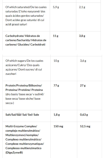 Whey protein concentrate, skimmed milk powder, aromas, emulsifier: soy lecithin; salt, stabilizer: sodium carboxymethylcellulose; sweeteners: sucralose and acesulfame-k; patented digestive enzyme digezyme® – multienzyme complex (amylase, lactase, cellulase, bacterial neutral protease and lipase), lactase, lactospore™ (bacillus coagulans, maltodextrin).